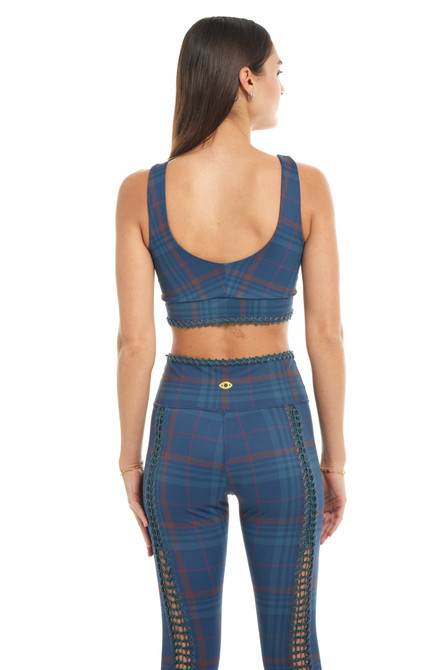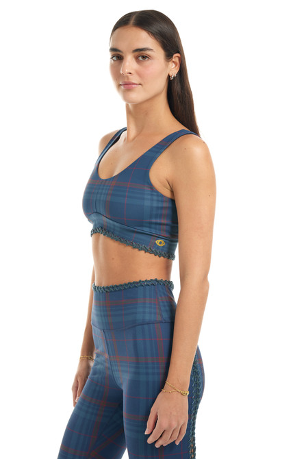 Performance bra with hand-stitched crochet detailing that's comfortable, perfect for yoga or pilates.